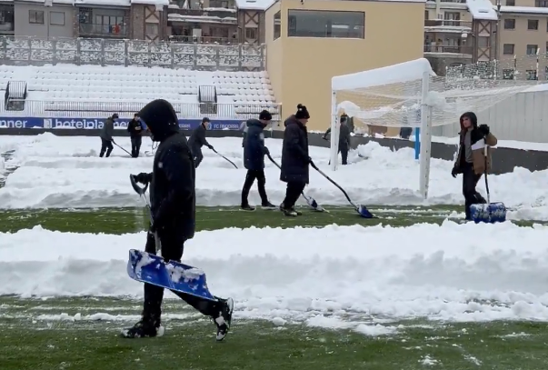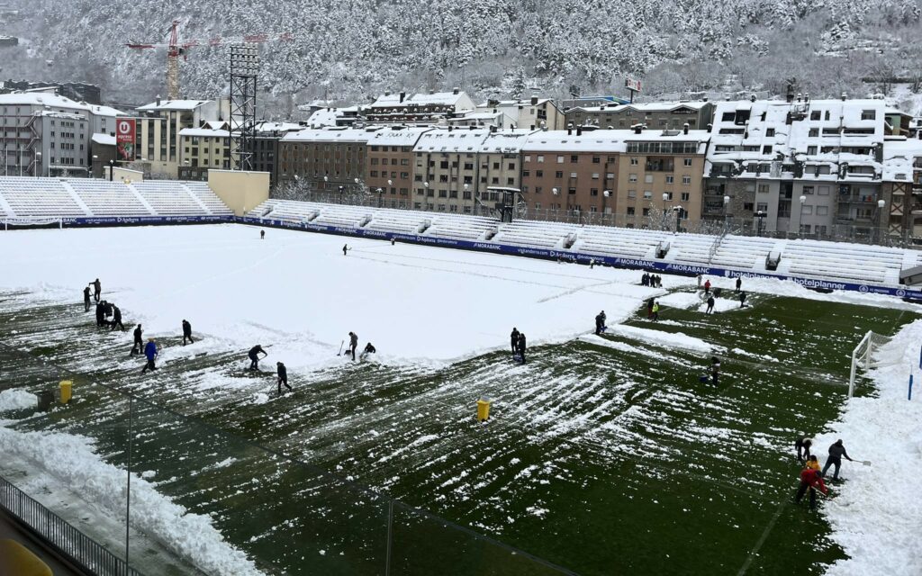 Aquest matí el FC Andorra dubtava de si es podria jugar el partit. “Hi ha 20 centímetres de neu sobre la gespa d’Encamp. Evidentment, hi ha possibilitat de suspensió. LaLiga i l’àrbitre tenen l’última paraula, però ara mateix no ho sap ningú”, ha valorat el FC Andorra. Davant la intensitat de la neu, LaLiga ha sol·licitat al Juez Único de Competiciones Profesionales la suspensió i aplacament del partit de LaLiga Hypermotion, però, finalment, continuen endavant amb el partit, així ho ha fet saber a través de les seves xarxes socials. Els clubs i els àrbitres celebren que el duel es disputi aquest dissabte a les 18:30 hores. Decenes de persones s’han aproporat amb pales, a més dels treblladors del camp, arran la crida de Piqué.